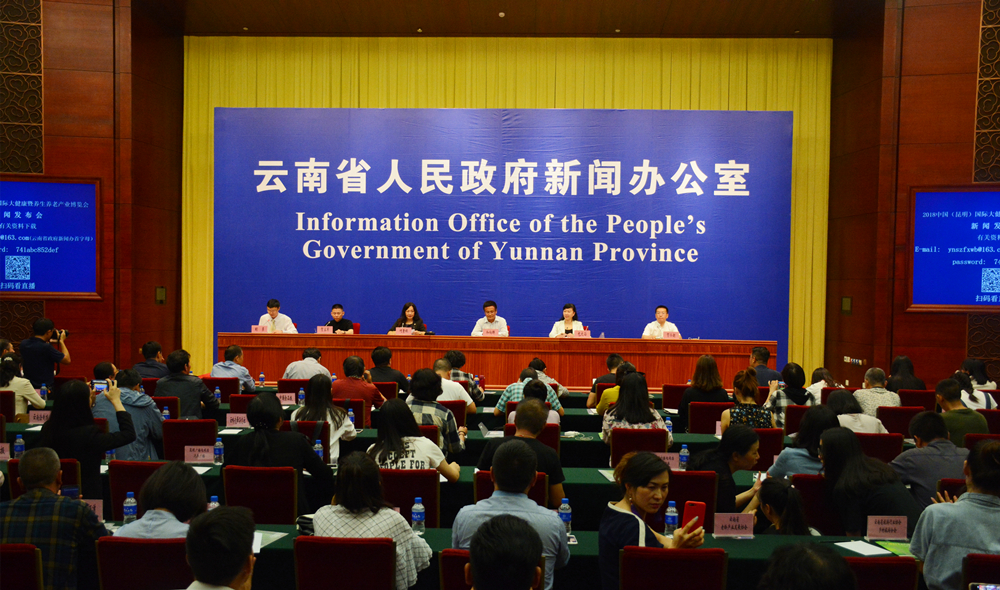云南省人民政府新闻办公室于2018年8月21日在海埂会堂玉兰厅召开2018中国(昆明)国际大健康暨养生养老产业博览会新闻发布会,发布昆明大健康产业相关情况,并回答记者提问。