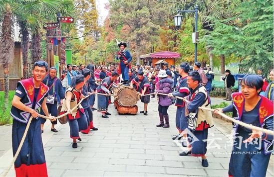 云南网讯 2018年元旦佤族木鼓节系列活动在云南民族村拉开帷幕。来自全国各地的游客与少数民族演员载歌载舞,喜迎新年。在“佤山鼓乐”活动中,佤族演员首次使用老虎鼓、木鼓、风筒鼓、铓锣等乐器共同演奏,赢得了大家的掌声。