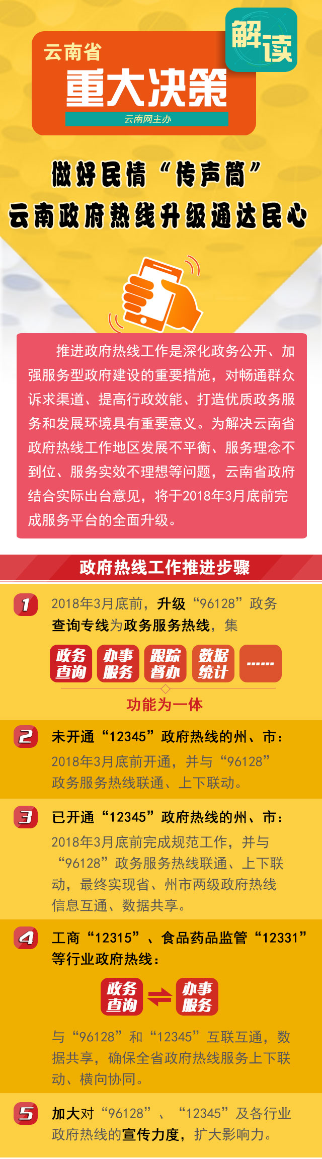 导语:推进政府热线工作是深化政务公开、加强服务型政府建设的重要措施,对畅通群众诉求渠道、提高行政效能、打造优质政务服务和发展环境具有重要意义。为解决云南省政府热线工作地区发展不平衡、服务理念不到位、服务实效不理想等问题,云南省政府结合实际出台意见,将于2018年3月底前完成服务平台的全面升级。