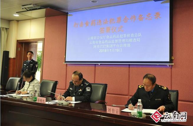 云南网讯(记者 赵岗)食品药品违法犯罪线上组织、线下实施难预防和打击?云南“三管齐下”模式出新招。1月19日,云南省公安厅食品药品犯罪侦查总队、云南省食品药品监督管理局稽查局、阿里巴巴集团平台治理部《合作备忘录》签署仪式在云南省公安厅举行。合作备忘录的签署标志着阿里巴巴与云南省联合预防、打击食药违法犯罪协作机制正式建立运行。