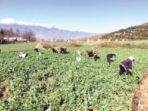 1月2日,在磨盘村大脑子村小组的地里,10多位妇女正娴熟地采收豌豆尖。一亩地的豌豆尖产量是503千克。负责收购豌豆尖的企业家舒英华现场支付货款1500元。磨盘村党支部书记李树平说:“种苞谷洋芋,每亩纯收入只有500来元,除掉成本,种植豌豆尖的收入高出了许多。”