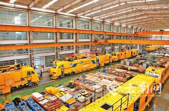 云南网讯 位于昆明市官渡区的中国铁建高新装备股份有限公司(简称铁建装备),生产制造的铁路大型养路机械在我国市场占有率超过80%,成为亚洲第一、世界第二的铁路大型养路机械制造商。图为该公司大型养路机械组装生产线。