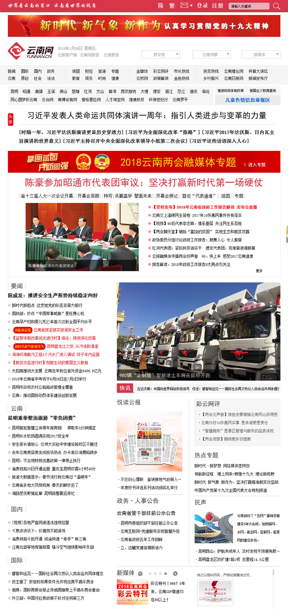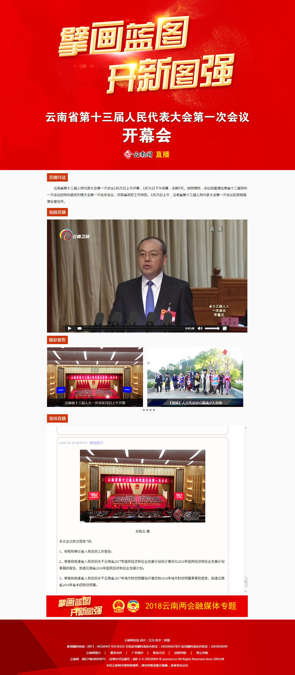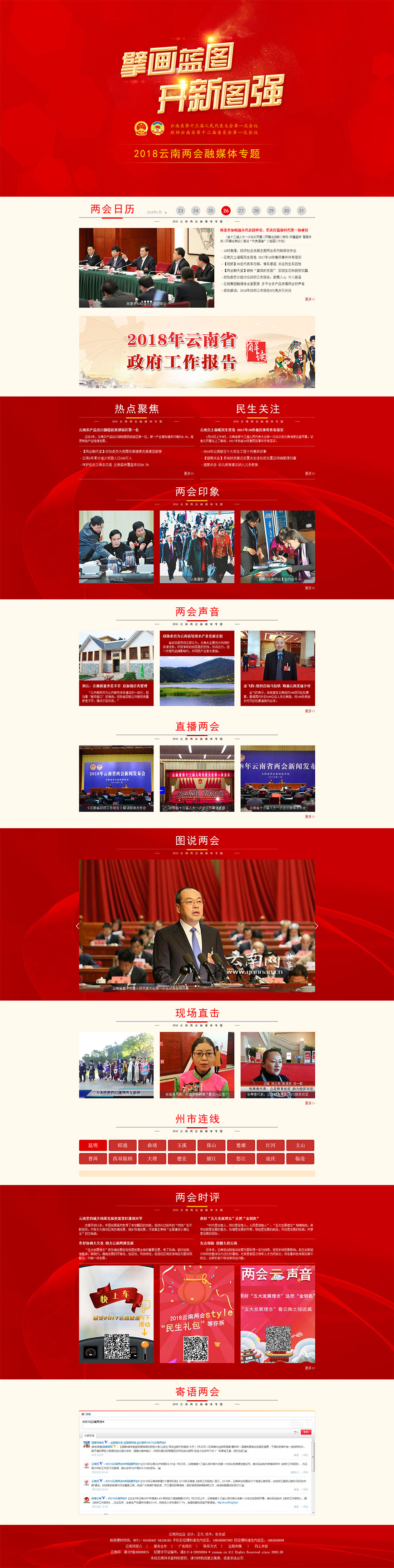 云南网对开幕大会进行PC和手机直播,让网民可以“随手”看两会;开设的“擘画蓝图 开新图强”融媒体专题和省两会微博话题,实时更新两会动态;独家受权发布的《2018年云南省政府工作报告解读》专题,以全面、权威、形象的特点备受关注。