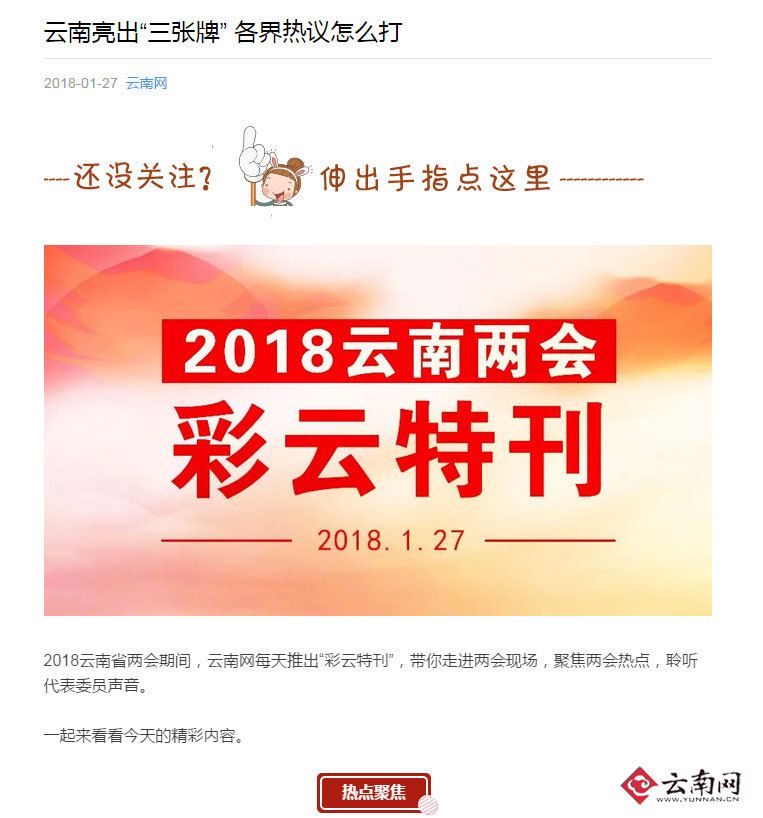 人代会开幕当天,云南网第一时间发布的新闻稿件《云南全力打造世界一流的三张牌》成为两会资讯焦点;继而推出的云南网专栏《政府工作报告里提到的“三张牌” 云南要怎么打?》 ,以及《2018云南两会彩云特刊》专题推出《云南亮出“三张牌” 各界热议怎么打》微刊,采访代表委员,谈观点说思考;同时,集纳了衡阳日报社总编辑林新华、《中国少数民族大辞典》系列云南编委会总编王立荣等人士的观点,形成了会场内外围绕“三张牌”的第一整合传播产品。