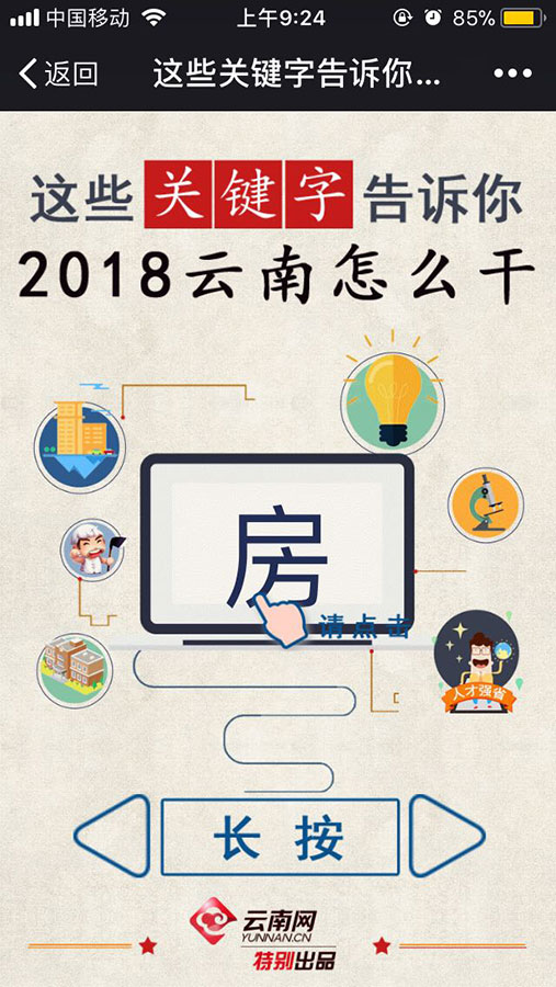 《2018云南两会style!民生红包等你拆》通过梳理云南2017年老百姓关注的各项民生工作,写成朗朗上口的文字,通过说唱的方式,最终制作成动画视频H5产品,唱出2018云南两会style。《奋进5年 云南答卷》、《迈进新时代 云南动感长卷》以动态长卷的形式,实现动静结合的精美阅读体验。《快上车 感受2017云南速度》以用高铁铁轨的形象进行排列,配上动态可操作画面,让产品极具动感,这些H5产品推出后受到众多网友喜欢和好评。