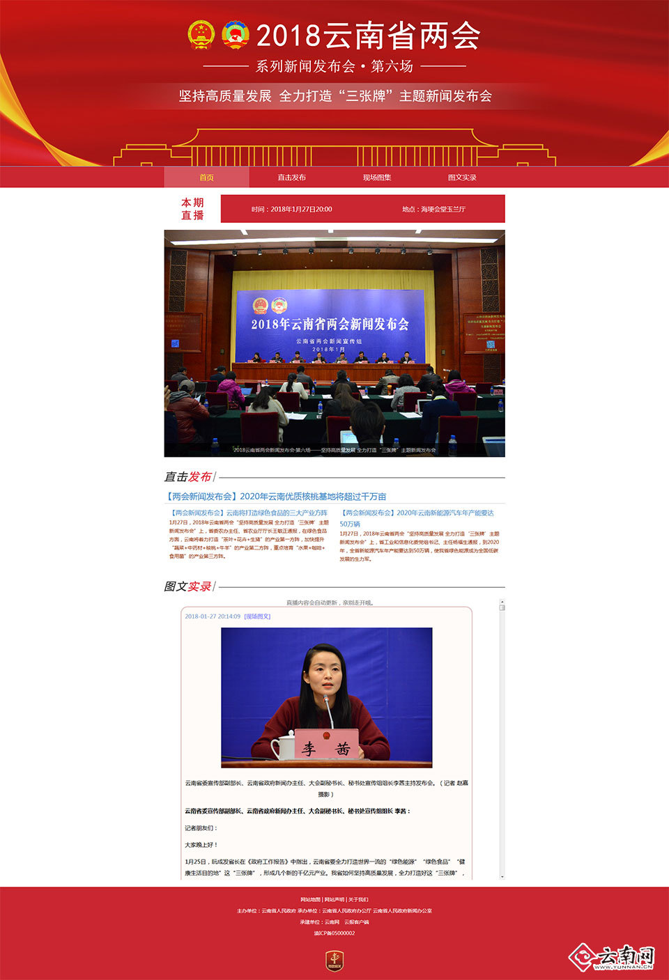 此外,云南网每日一场“2018年云南省两会新闻发布会”直播,围绕经济发展、政府工作报告解读、民生保障、依法治省、脱贫攻坚等主题,聚焦云南经济社会各方面发展变化。