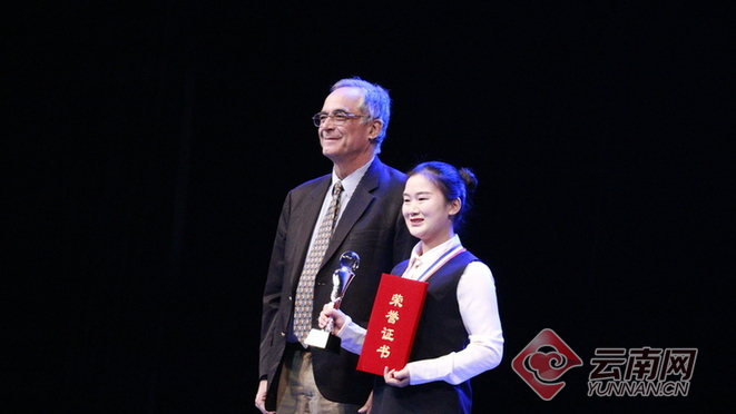 国际咖啡组织执行董事候塞赛特先生为第六届中国普洱咖啡杯世界虹吸壶大赛中国区总决赛亚军获得者袁玲颁奖。云南画报 李晓超拍摄