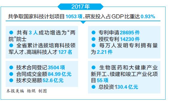 不断夯实科技创新基础,大众创业万众创新取得新进展。2017年,我省共有3人成功增选为“两院”院士,全省累计选拔培育科技领军人才、高端科技人才127名;新增省级创新团队28个,累计206个;新建院士专家工作站109个,累计348个;新认定高新科技企业145户,总数达1239户,居西部省(市、区)第四位。统计数据显示,2017年全省技术合同登记3504项,合同成交金额84.99亿元,技术交易额52.6亿元。全省专利申请28695件,授权专利14230件,每万人发明专利拥有量为2.21件。
