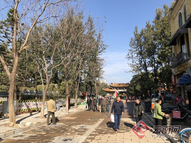 云南网讯(记者 龙舟)虽然新植的树木还未发芽,部分路边小品还未完工,但整齐划一的青石板路面,开阔的视野已能让人感受到浓浓的老昆明味道。2月11日,翠湖周边历史文化片区整治提升工作中的“两坡一街”示范工程接近尾声,并正式向市民开放。