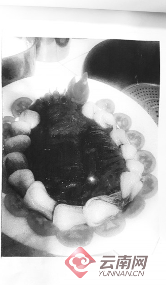昆明市森林公安局民警介绍,去年3月27日,昆明市森林公安局接到群众匿名举报信称:“昆明市某餐厅厨师刘某某涉嫌非法贩卖、加工国家级保护动物熊掌”。信中还附着两张照片,一张照片中一名男子用手抱着一只疑似熊掌的动物制品,一张是疑似熊掌被加工好装盘的照片。