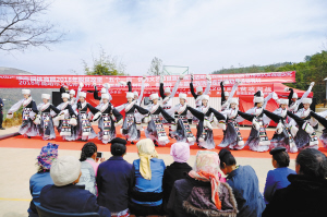 2月1日,昆明气温跌破零度,但在禄劝县团街镇治安村的文体操场上,却是一幅热火朝天的景象:放置在操场上的六排长条板凳,被早早闻讯赶来的村民们坐满了;操场中央,来自昆明市民族歌舞剧院的30多名演员一会儿表演带有高难度托举动作的舞蹈,一会儿吹拉起唢呐、二胡和琵琶,引发村民们的阵阵掌声和欢呼。