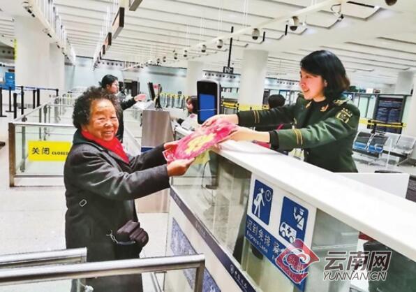 据了解,在出境现场,昆明边检官兵们早早就准备了节日贺卡、灯笼、香包、狗年“旺旺”吉祥物等年味十足的礼物,并写上节日寄语。在办理完边检手续后,官兵们便将充满祝福的礼物送给旅客。 准备和家人出境到清迈游玩的李奶奶接过边检官兵送上的“福”字贴后笑得合不拢嘴。将春节祝福融入到边检服务,推出“年味”温馨服务,为出入境旅客送上精美的礼物和温馨的祝福,已成为这个站在提高边检服务水平中的一项举措。