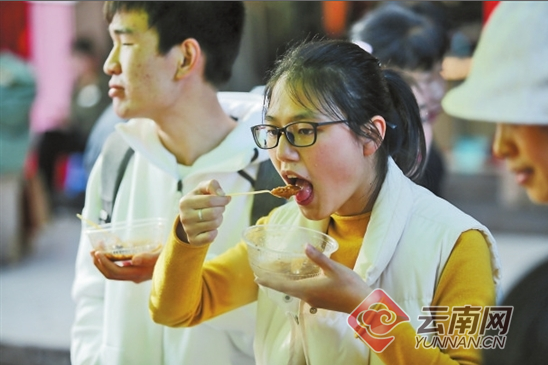 玉溪:米线节人气旺春节期间,玉溪米线节迎来了八方游客,大营街主会场游客如织,人们来此开心品尝米线和各类美食。记者 张彤 摄
