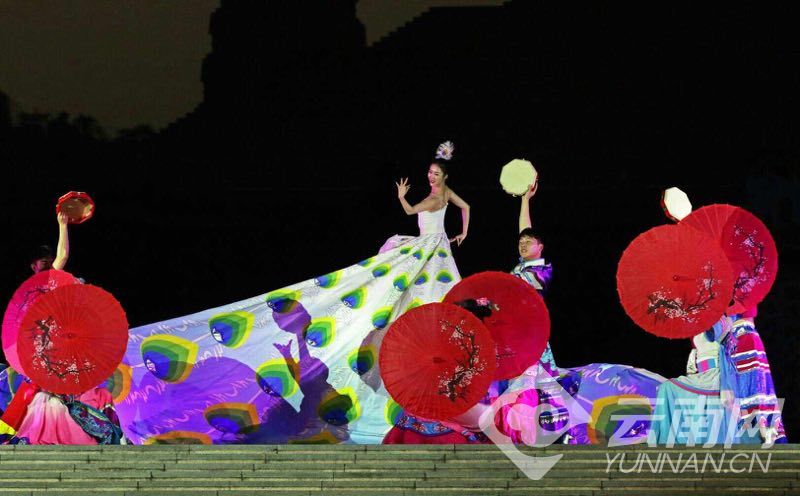 此次演出最大的亮点是“光照大千—3D光雕祈福活动暨提灯大会”。当美丽的孔雀舞与3D灯光融合在一起,“男孔雀”们手捧象征幸福、欢喜的摩尼宝珠起舞,“女孔雀”们翩翩起舞……光影照耀、孔雀呈祥,绚烂的烟花在天空中绽放,全场沸腾!