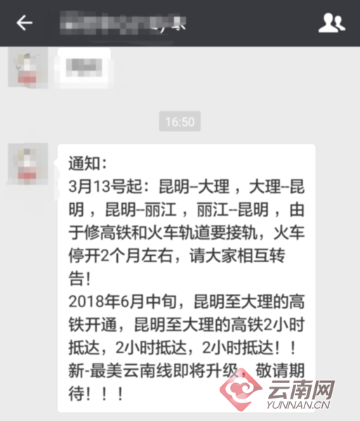 云南网讯(记者 黄翘楚)3月5日,一则“因广大铁路火车轨道接轨等原因,导致昆明至大理、昆明至丽江方向往返列车将于3月13日起停运,并将停开2个月左右”的消息在网上流传,引发了不少网友和旅客的担心和误解。