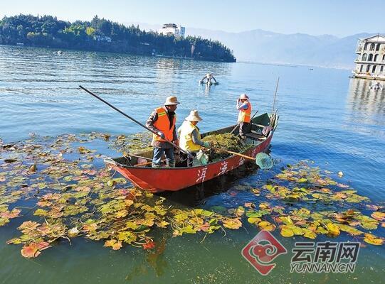图为大理双廊镇的保洁人员及时清除水面浮萍。(记者 黄喆春)