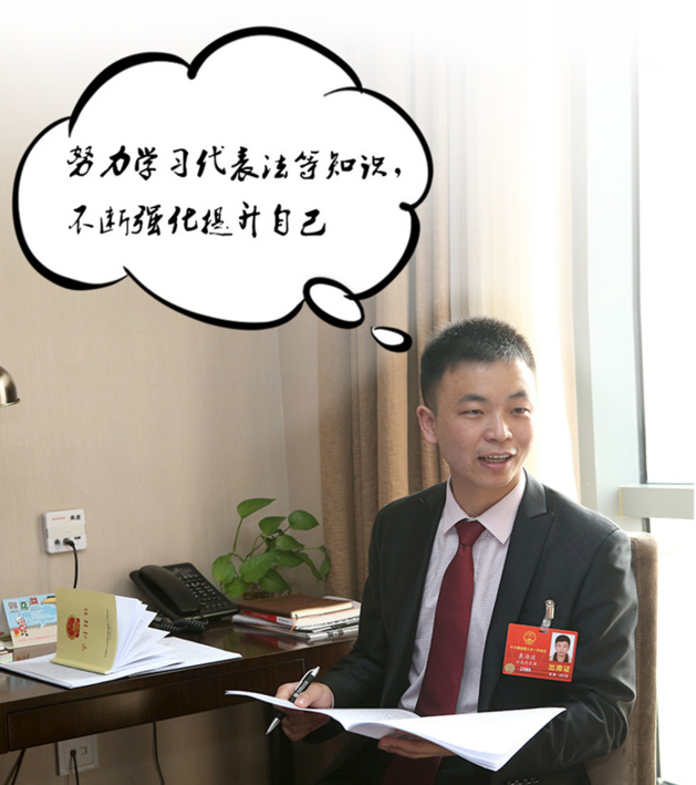走进袁海波代表的房间,桌上整齐摆放的一本本笔记本、文件、材料,袁海波说,他正在努力学习代表法等知识,不断强化提升自己。作为一名“90后”代表,谈起履职时,袁海波身体前倾、语速很快,言语间洋溢着难掩的激动与自豪。