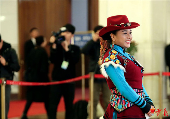 14时5分,茸芭莘那出现在采访区。窄袖高领、彩带束腰、坎肩缀饰、长裙飘逸,身着普米族盛装的茸芭莘那成为中外记者镜头前一抹绚丽的色彩。但在跑会的老记者眼中,茸芭莘那更是一个执著的“老委员”。