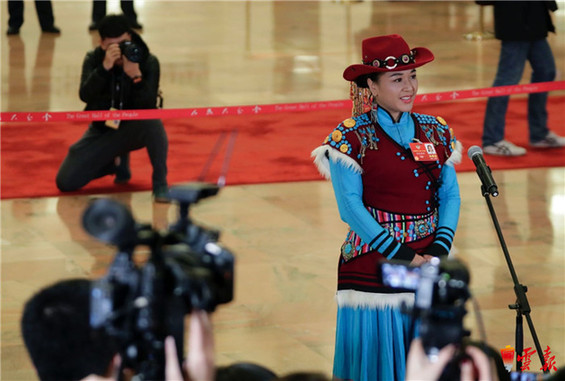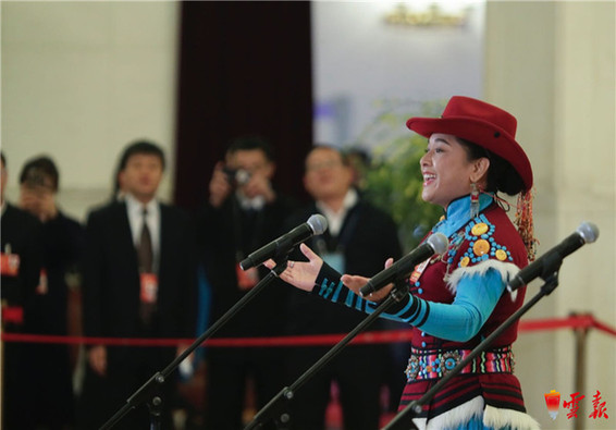采访结束后,茸芭莘那还用普米族语言唱了一首歌,这也是今年两会代表委员通道开设以来,现场第一次传来歌声: