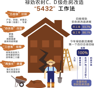 禄劝在农危房改造进程中结合实际,探索出“五层级识别、四类型改造、三统筹保障、两强化质量”的“5432”工作法,将全县符合农村C、D级危房改造标准,包括建档立卡贫困户四类重点对象和非贫困户在内的55730户群众全部纳入开展实施,坚决消除农危房安全隐患。按照“全面摸排、专家审查、五级签字、村组公示”的方式,户主、村组、村委会、乡镇(街道)、专家“五层级”识别,精准锁定每一户C、D级危房,经公示无异议后,统一危房认定标准和具体改造内容,确保安居保障精准不漏一户;之后,按照修缮、加固、拆除重建、政策兜底帮建“四类型”改造,因房分类精准施策注重实效;在改造过程中,又通过统筹资金投入、统筹建材供给、统筹施工力量“三统筹”保障,合力推进全县农村危房改造;在全县农危改实施过程中,注重强化安全设计、强化质量监管“两强化”质量,确保每户群众的房屋最终达到安全稳固标准。到目前,禄劝全县5.5万余户农危房改造的开工率及竣工率分别达到93.7%和86.1%,全县正向着在今年脱贫摘帽第一个百日会战内,全面完成农村危房改造,实现100%入住、100%建新拆旧、100%危房户有1000元收入、100%档案齐备的目标冲刺迈进。