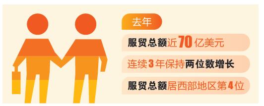 综合近几年数据,云南服务贸易进出口总额居西部地区第4位,全国第17位。为加快服务贸易发展,我省出台了相关实施意见,编制了服务贸易和服务外包发展“十三五”规划。用好中国(北京)国际服务贸易交易会等多个平台,明确全省服务贸易和服务外包发展方向,拓展了市场空间。同时,着力通过省级服务外包示范城市和示范园区的创建,推动服务贸易发展。2017年,昆明市成为我省第一个省级服务外包示范城市。今年,玉溪高新区、曲靖经济技术开发区拟申报云南省服务外包示范园区,云南海归创业园拟申报云南省服务外包示范基地;全省将积极培育市场主体、支持重点企业发展壮大。2017年,我省认定省级服务外包重点企业及培训机构10家,省级文化出口重点企业11家,省级中医药重点企业10家。