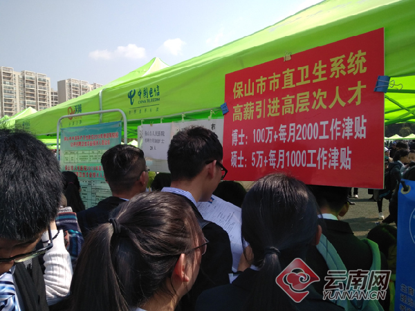 双选会现场,用人单位纷纷在招聘简章上标明福利待遇吸引毕业生,但保山市市直卫生系统展台却格外引人注意,一张写着“博士:100万+每月2000工作津贴”的红色宣传牌极其醒目,引发大家的好奇与关注。