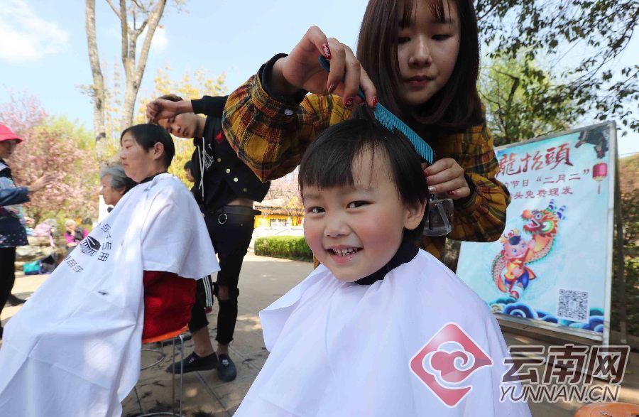昆明黑龙潭公园请来专业理发师为市民免费理发,传承老昆明“剃龙头”的传统习俗。