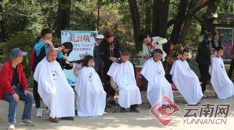 昆明黑龙潭公园请来专业理发师为市民免费理发,传承老昆明“剃龙头”的传统习俗。