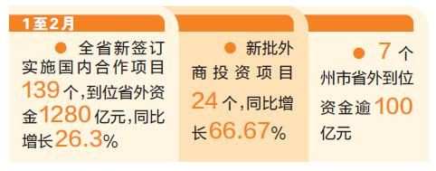 记者近日从省招商合作局获悉,今年1至2月,全省新签订实施国内合作项目139个,共到位省外资金1280亿元,同比增长26.3%;全省共新批外商投资项目24个,同比增长66.67%。