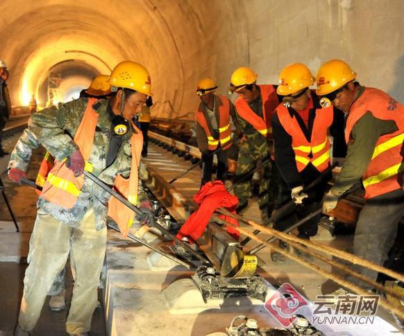 今年2月份祥和隧道安全贯通后,隧道承建单位中铁十七局集中调派玉磨铁路、郑万铁路、成渝铁路等项目的17个项目经理、4个劳务队1000多人昼夜开展隧道衬砌、无砟轨道等施工,彻底清除“拦路虎”,全线顺利铺通。