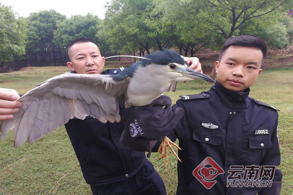 云南网讯(实习记者 夏方海 通讯员 王景辉)近日,巍山县森林公安局民警接到报警电话,一只在树上安家的国家二级野生保护动物夜鹭被大雨击落,接到报警电话后,巍山县森林公安局民警及时出警救助。在确定夜鹭无恙后,民警将其带至与其栖息习性相似的地方进行放生,让其重返大自然。