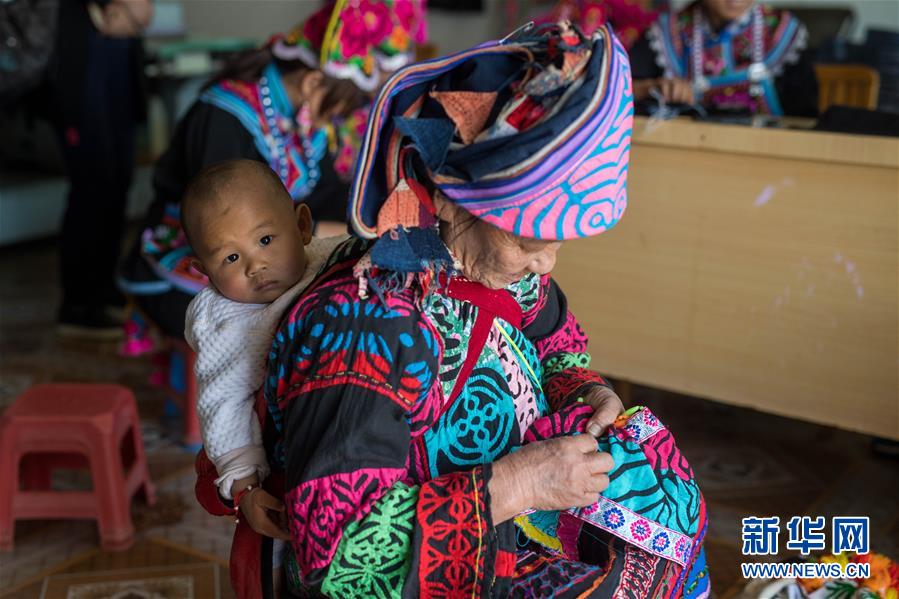 在永仁县晓丽绣品专业合作社,一名背着孩子的老人在绣制彝族服饰(4月5日摄)。