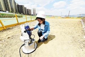 通过便携式风洞仪测试并比较使用抑尘剂及没使用的实验地块的单位时间微粒数量。记者王俊星摄