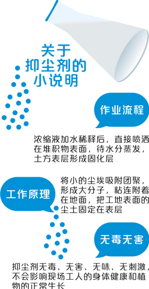 抑尘剂是一种无色无味的浓缩液,通过加水稀释后,直接喷洒在堆积物表面,待水分蒸发,土方表层就会形成3毫米至5毫米厚的固化层,从而起到避免扬尘的效果。