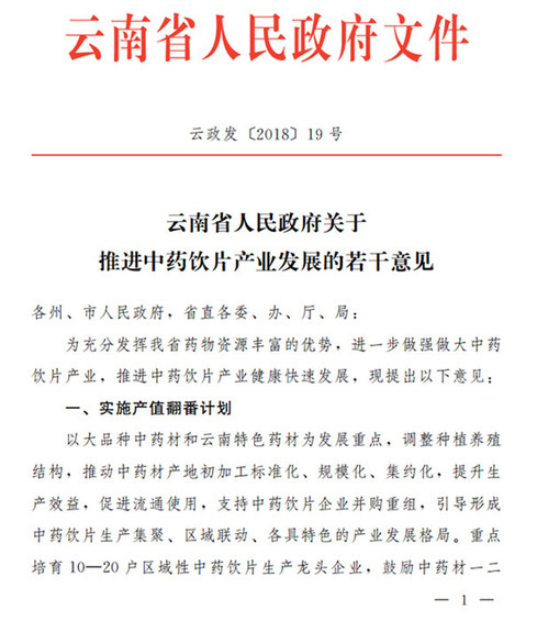 《意见》提出,云南将实施中药饮片产业产值翻番计划,重点培育10户到20户区域性中药饮片生产龙头企业,鼓励中药材一二三产业融合发展,到2020年,中药饮片全产业链经济总量比2016年翻一番,实现千亿元产值发展目标。
