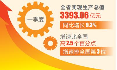 4月19日,省统计局通报一季度全省经济运行数据显示:一季度,全省实现生产总值3393.06亿元,同比增长9.3%,增速比全国高2.5个百分点,增速排全国第3位。