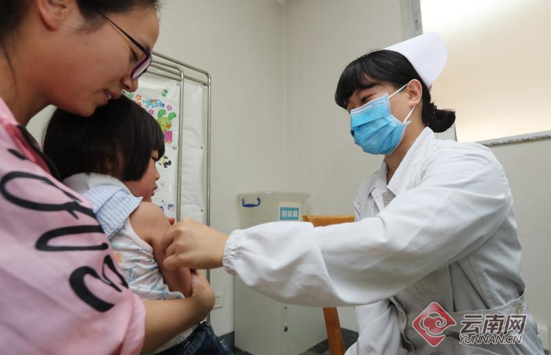 昆明市延安医院预防保健科医生正在为接种疫苗的新生儿进行体检。
