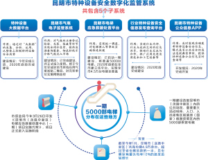 《指导意见》出台的目的,是为了预防特种设备事故,保障人身和财产安全。《指导意见》明确了2018-2020年要完成的4项工作任务,分别是推进昆明市特种设备安全数字化监管系统建设(该系统包含5个子系统,详见图表);2020年底实现全市特种设备安全数字化监管标识全覆盖,扫描监管标识上的二维码,可准确显示特种设备详细信息,实现智能化识别、定位和管理;2020年底前实现规模以上企业应用昆明市特种设备安全数字化监管系统全覆盖,引导企业应用监管系统对本单位设备进行内部管理,主动开展安全自查和隐患治理等;今年底前推行特种设备行政审批“清单管理”,优化审批流程,缩短办事时间。