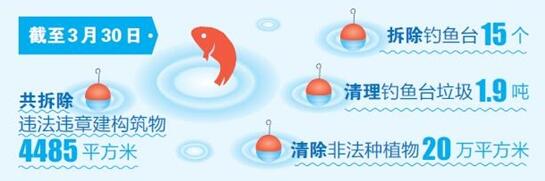 3月15日,通海县召开了侵占河堤、湖岸违章建构筑物整治活动动员会,全县掀起了拆除河堤、湖岸违章建构筑物高潮。截至3月30日,全县共拆除违法违章建构筑物4485平方米,拆除钓鱼台15个,清理钓鱼台垃圾1.9吨,清除河道两岸、库区非法种植物20万余平方米。