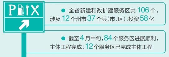 高速路服务区不仅是休息的驿站、服务的载体,更是旅游的名片、形象的窗口。一年前,我省把高速路服务区整治提升作为全省交通运输工作的重要任务,切实抓紧抓好。省交通厅积极贯彻落实部署,研究制定高速公路服务区整治提升一年行动计划,深入开展改扩建和新建工程、基础设施提升、环境卫生整治。根据省政府统一规划,全省新建和改扩建服务区共106个,其中改扩建80个,新建26个,涉及12个州市37个县(市、区),投资概算58亿元。