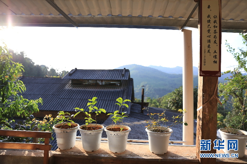 肖时英居住的小院里有许多关于茶文化的名人名言,还种植了一些茶叶植株作为研究。 新华网 丁凝摄