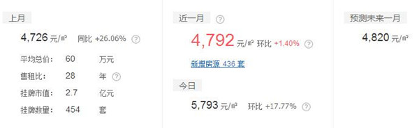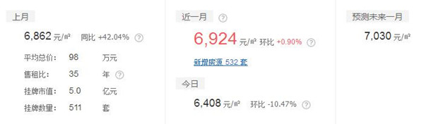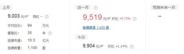 从中国房价行情网发布数据看,房价近一月最高为9519元/㎡,新增房源1430套,单价环比前一月增长5.73%。