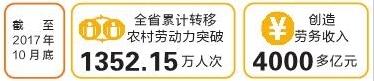 如何破解农村劳动力“不想出和不敢出、不知道去哪里、出去做不了、做了拿不到工资”的一系列难题?按照省委、省政府“劳务输出到哪里,人社部门的服务就要跟进到哪里”的要求,省人社厅变压力为动力,加强绩效管理,让农村劳动力培训转移就业成为我省的致富产业。截至2017年10月底,全省累计转移农村劳动力已突破1352.15万人次,创造劳务收入4000多亿元。