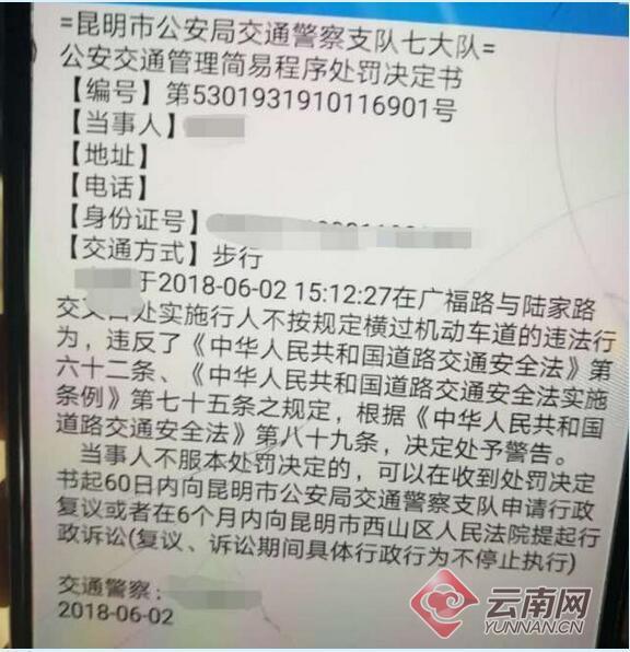 5月31日下午5点半,昆明交警七大队民警在广福路与陆家路的交叉口对一名闯红灯的行人开出罚单作为警告,这是昆明市开出的首张行人闯红灯罚单。
