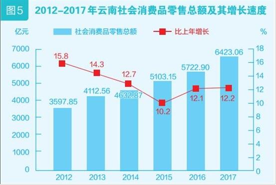 全年社会消费品零售总额6423.06亿元, 比上年增长12.2%。按经营地统计,城镇消费品零售额5534.08亿元,增长12.1%;乡村消费品零售额888.98亿元,增长13.1%。按消费形态统计,商品零售额5475.26亿元,增长12.1%;餐饮收入额947.80亿元,增长13.3%。
