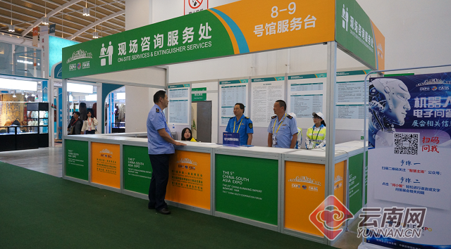 过往几届的中国-南亚博览会,琳琅满目的各国商品,极大地促进了中方与南亚国家的贸易交流。今年,南博会同样专设了8、9场馆作为南亚国家商品展示、交流的场馆。在8、9号场馆间,官渡区市场监督管理局的工作人员正值守在消费者投诉的热线旁,随时准备处理场馆现场和12315转来的消费投诉。