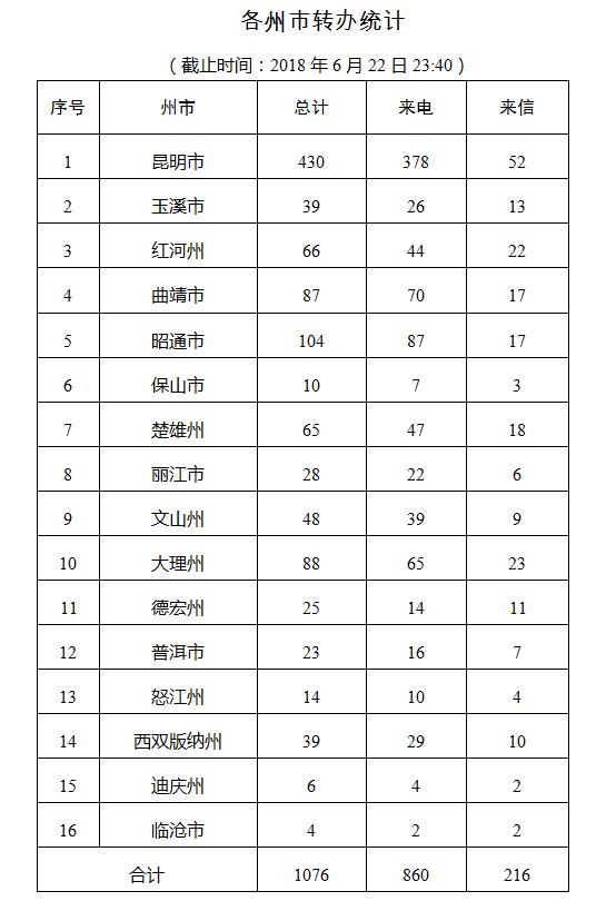 截止目前共计接收到中央第六环保督察组十八批次共计1076件交办件,其中来电举报860件,来信举报216件,涉及16个州(市),重点关注案件360件。