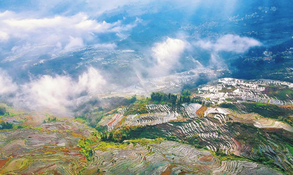 冬日,元阳哈尼梯田如万千银镜错落铺展,银波荡漾间,斑斓色彩交织辉映,宛如大地调色盘般的绝美景致吸引了全国各地的游客。