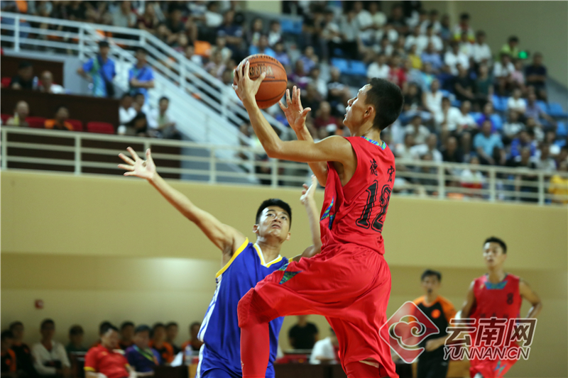 在省运会篮球男子甲组半决赛中,德宏队(红衣)93:74胜普洱队。云南网记者 孙晓云 周灿 摄