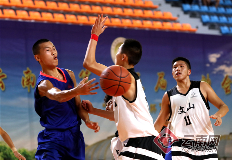在省运会篮球男子甲组半决赛中,曲靖队(蓝衣)84:77胜文山队。云南网记者 孙晓云 周灿 摄